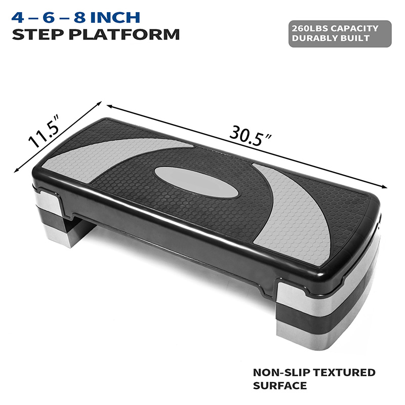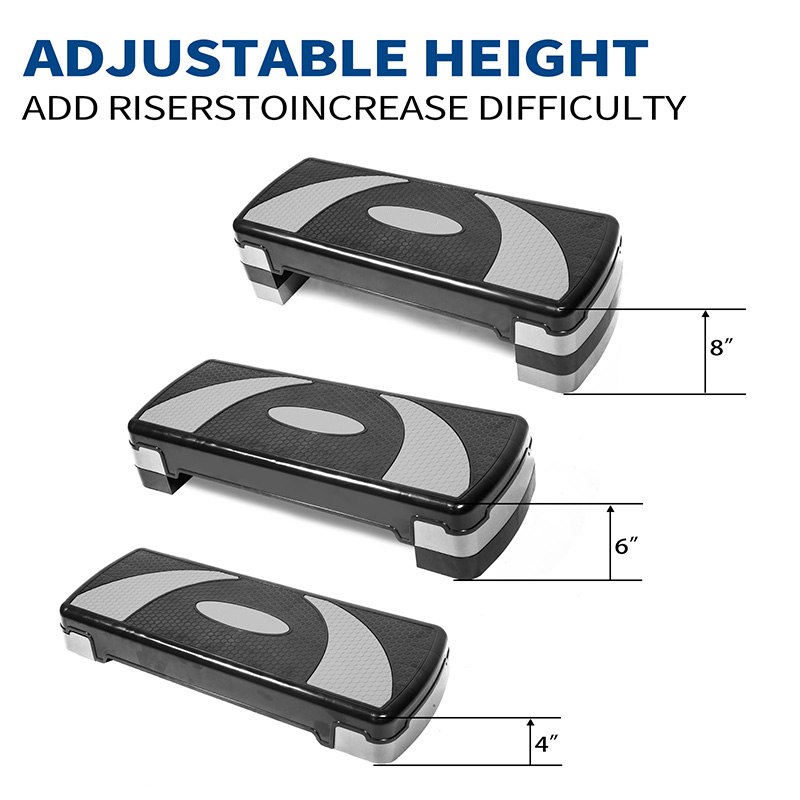 1。高度可调:有氧运动踏板通常配备高度可调功能。用户可以根据自己的体能水平和训练目标选择合适的踏板高度。这种设计使踏板训练更加个性化,可以满足不同用户的锻炼需求。